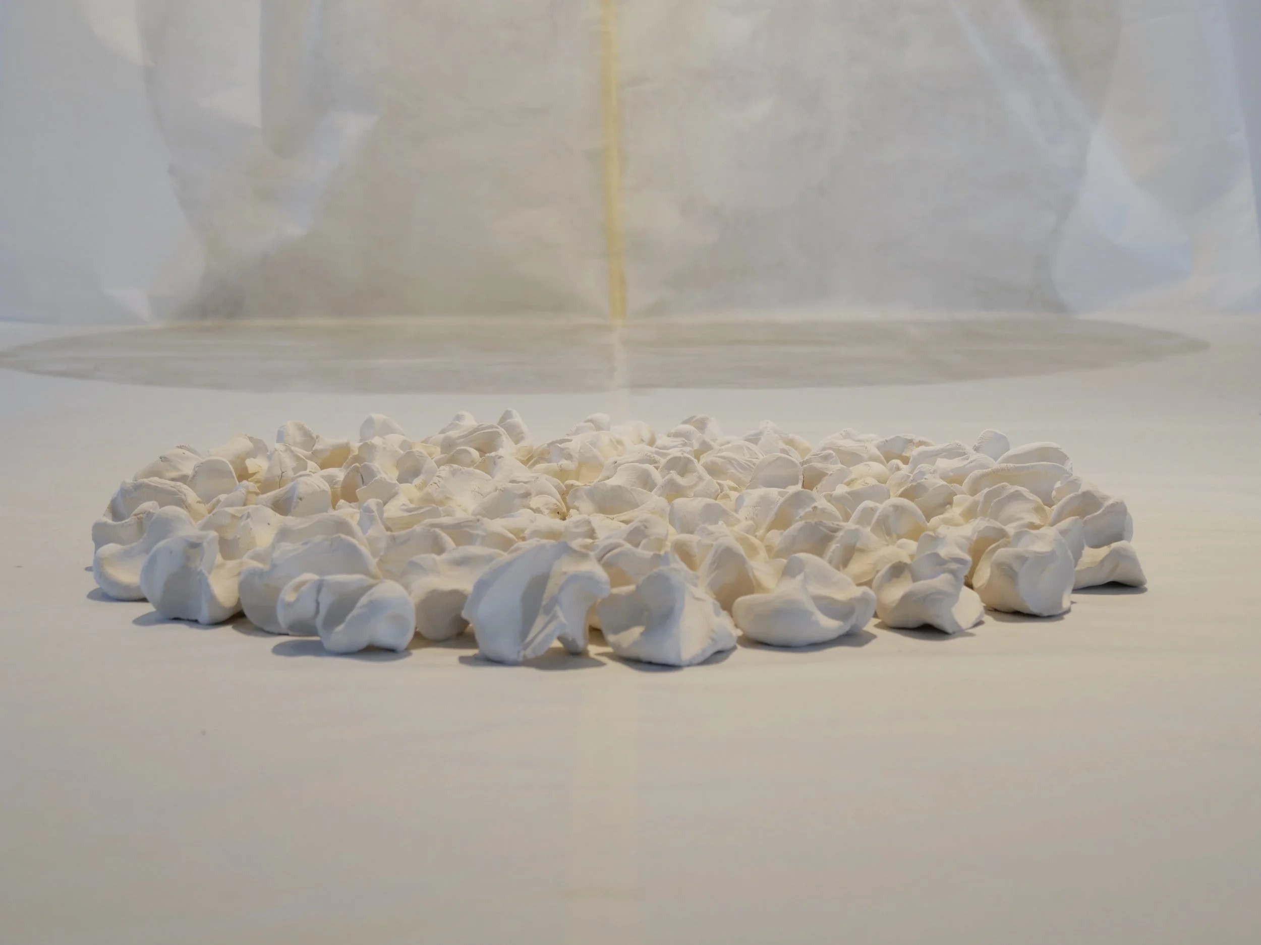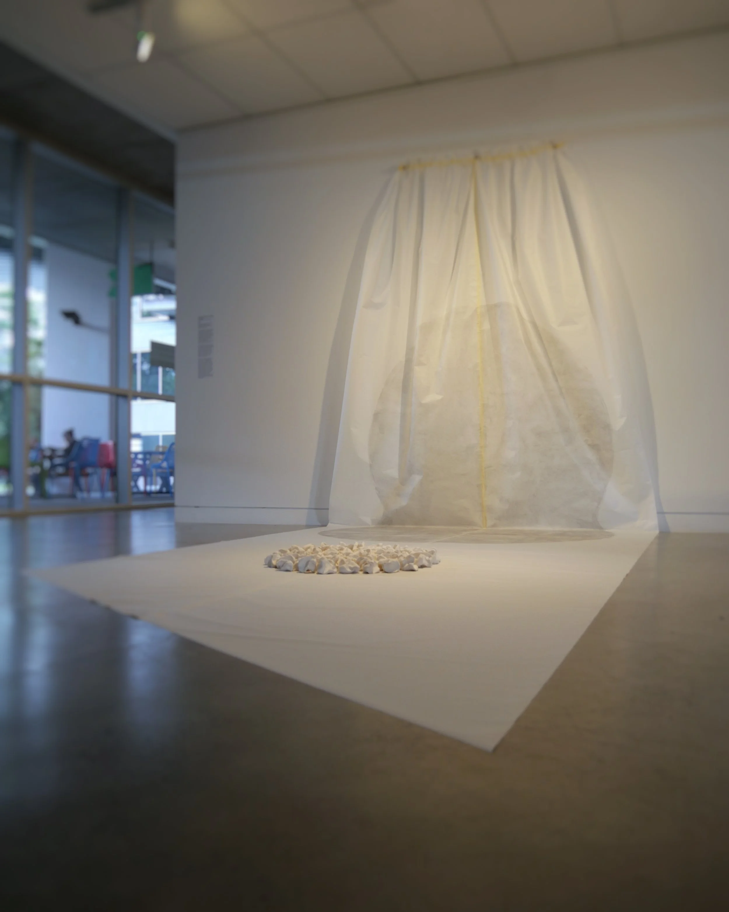 Felicity Celeste Bruce and Oliver Strauss, Untitled [Shape and Shade II x Safe Home), 2025, Graphite, masking tape, cotton thread and porcelain on mulberry bark paper, 600cm (length variable) x 190 cm (width variable) x 160 pieces (variable). Detail and installation view, photographed credit: Felicity Celeste Bruce.