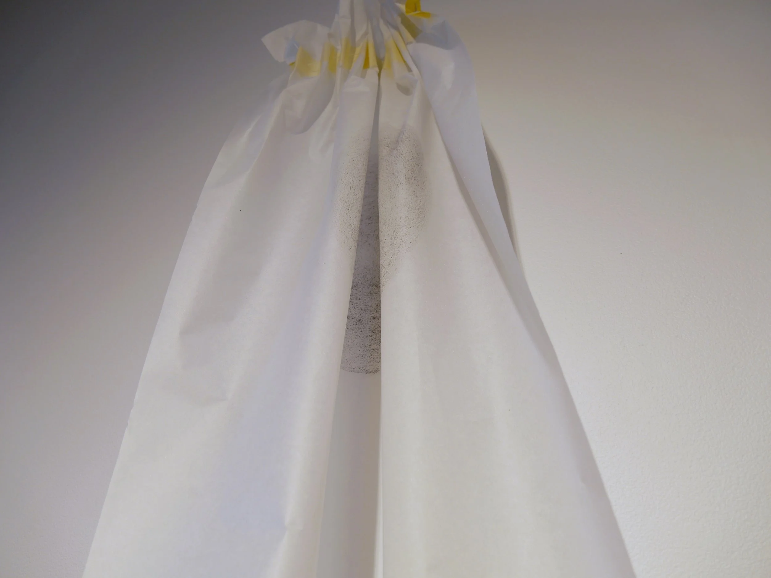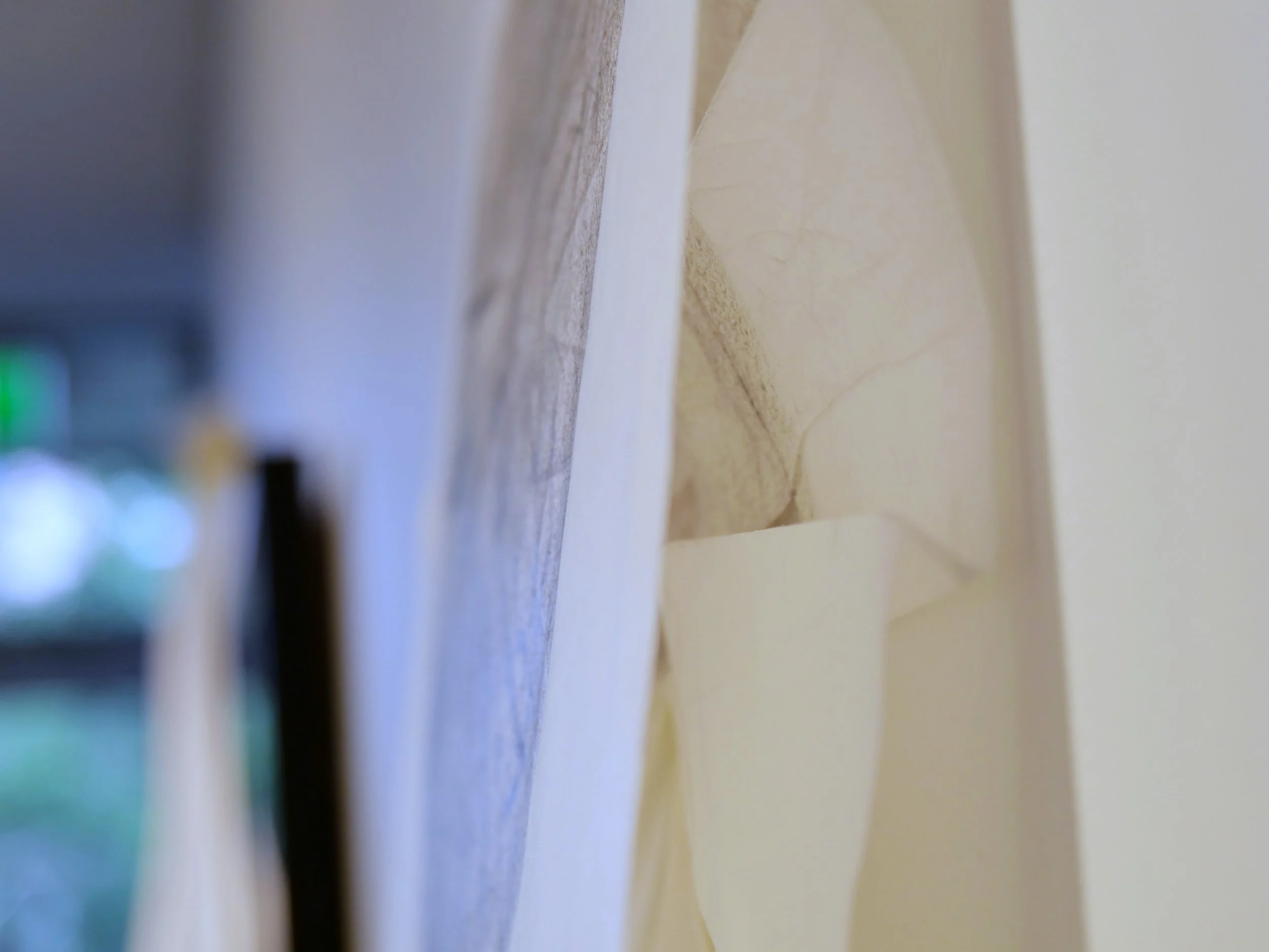 Felicity Celeste Bruce, Non-concordance, 2025, Graphite, masking tape and cotton thread on mulberry bark paper, 46cm (width variable) x 200cm. Detail, photographed credit: artist.