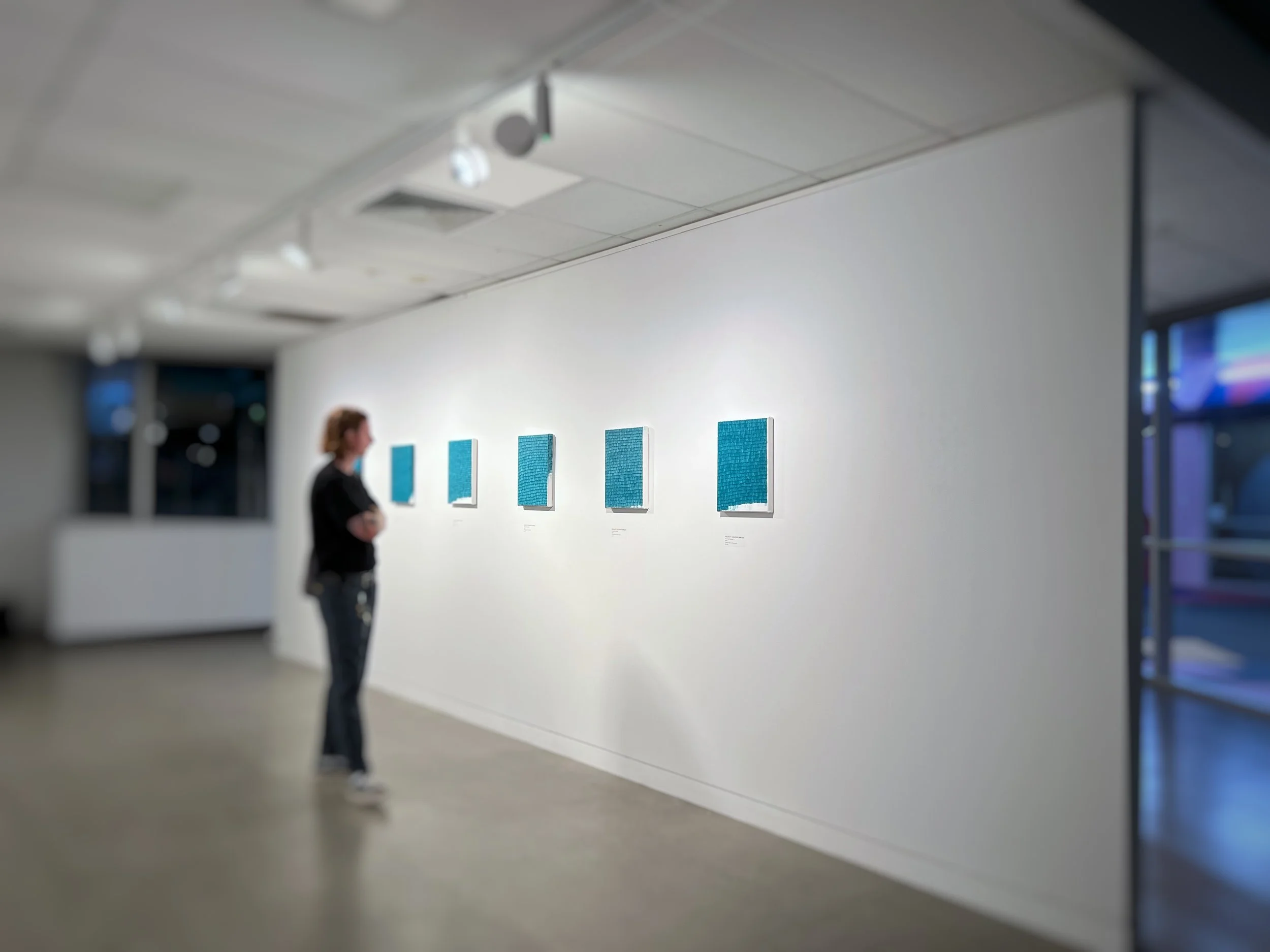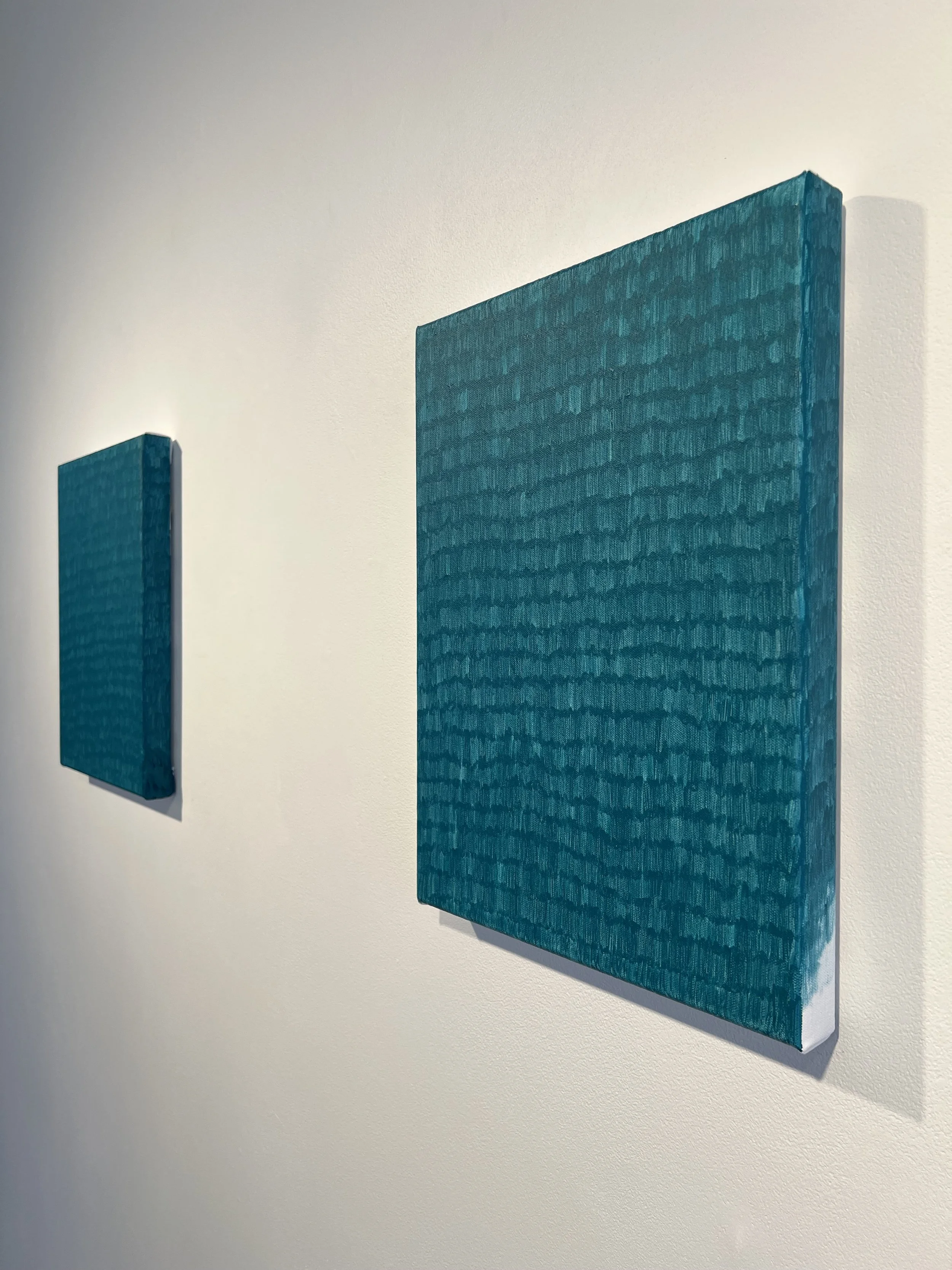 Felicity Celeste Bruce, Too Much Canvas/Not Enough Canvas (series), 2025, Acrylic on canvas, 12” x 16” each. Installation view, photo credit: artist.